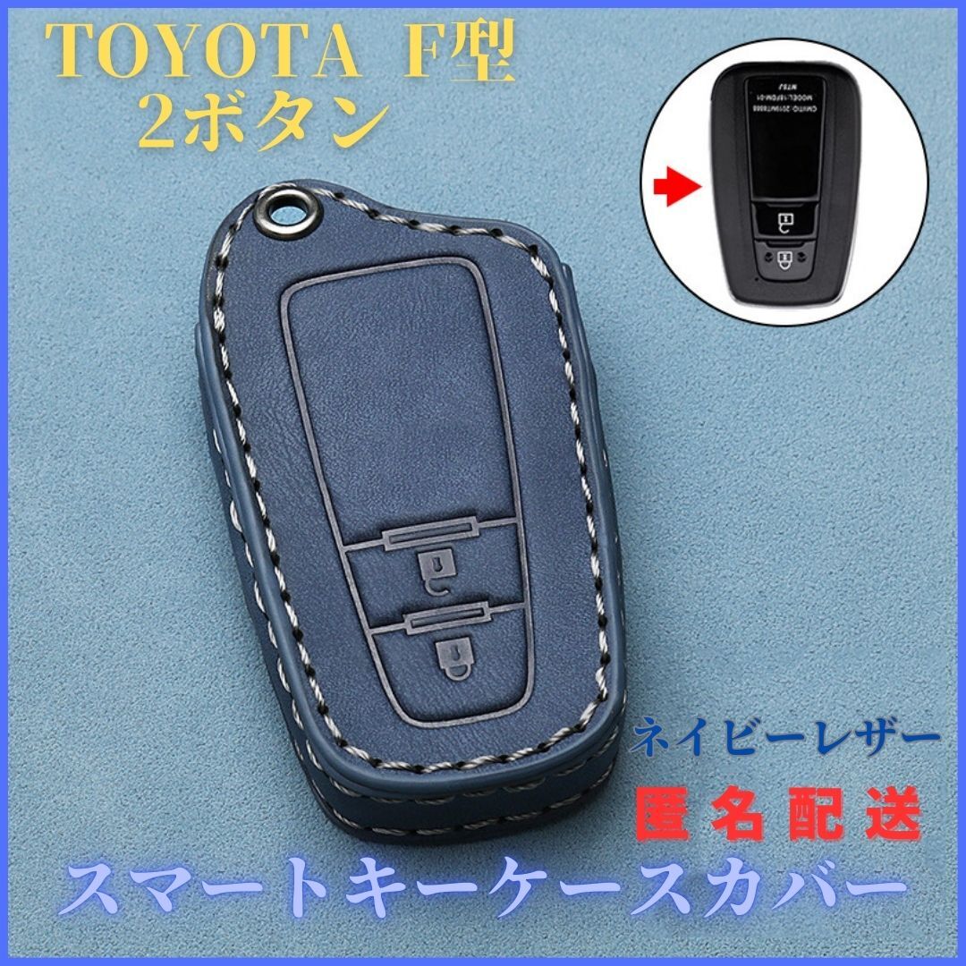 > キーケースカバートヨタF型 2ボタン プリウス50系クラウン220系 RAV4 50系ランドクルーザープラド150系など スマートキーレザー本革紺