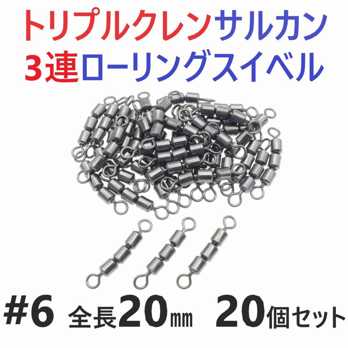 > 【送料150円】トリプルクレン サルカン 3連 ローリングスイベル #6 全長20㎜ 強度30㎏ 20個セット 強力ヨリモドシ 超回転で糸ヨリ解消!