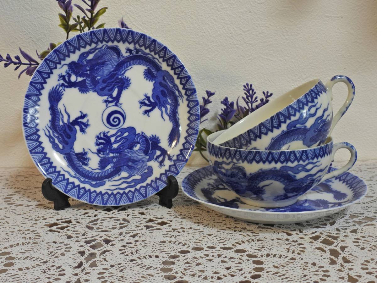 > 2セット・エッグシェル・コーヒーカップ&ソウサー・ブルー染付・龍絵柄