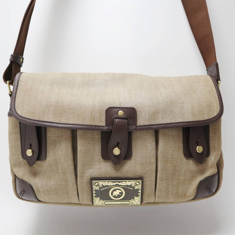 > HUNTING WORLD ハンティングワールド ロゴプレート キャンバス/レザ― ショルダーバッグ ベージュ/ブラウン S07-k036