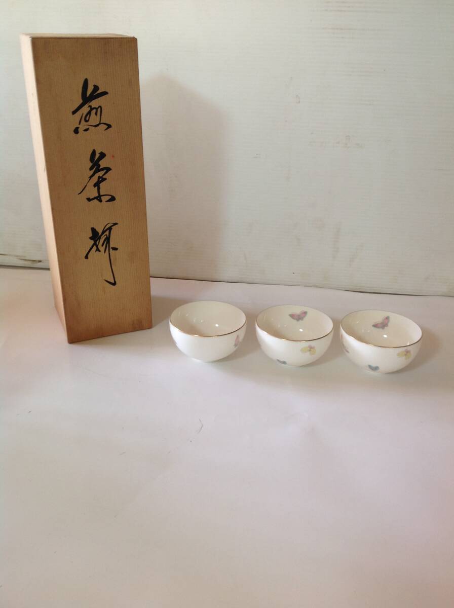 - *和光園 蝶柄 陶器 茶器 陶彩 湯呑み 煎茶 緑茶 茶碗 和食器 3客 箱付 中古品 現状品*