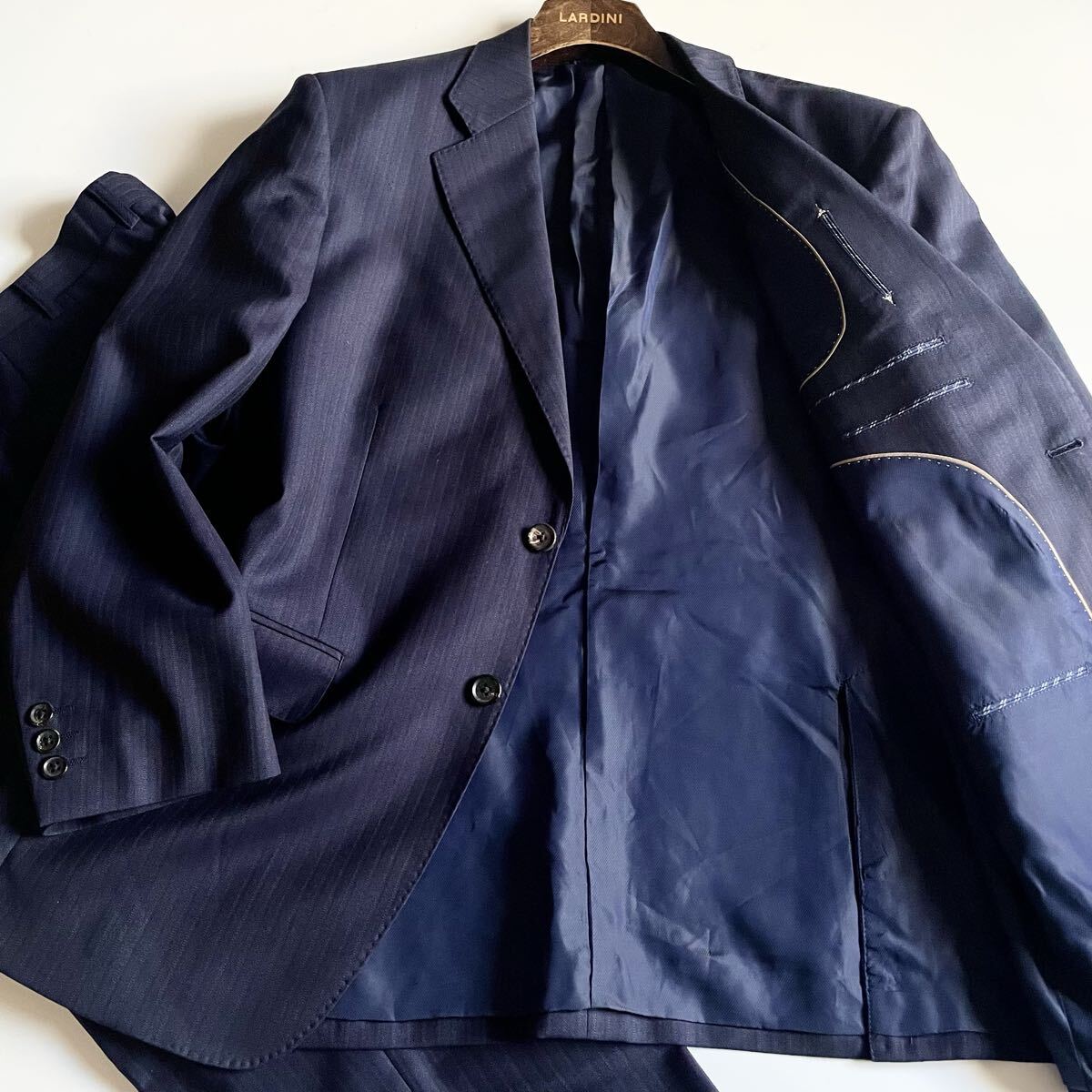 > 【美品】ErmenegildoZegna イタリア名門ゼニア トラベラー生地 ウール100 ネイビー ストライプ 総裏 セットアップ スーツ BB5 L-XL相当