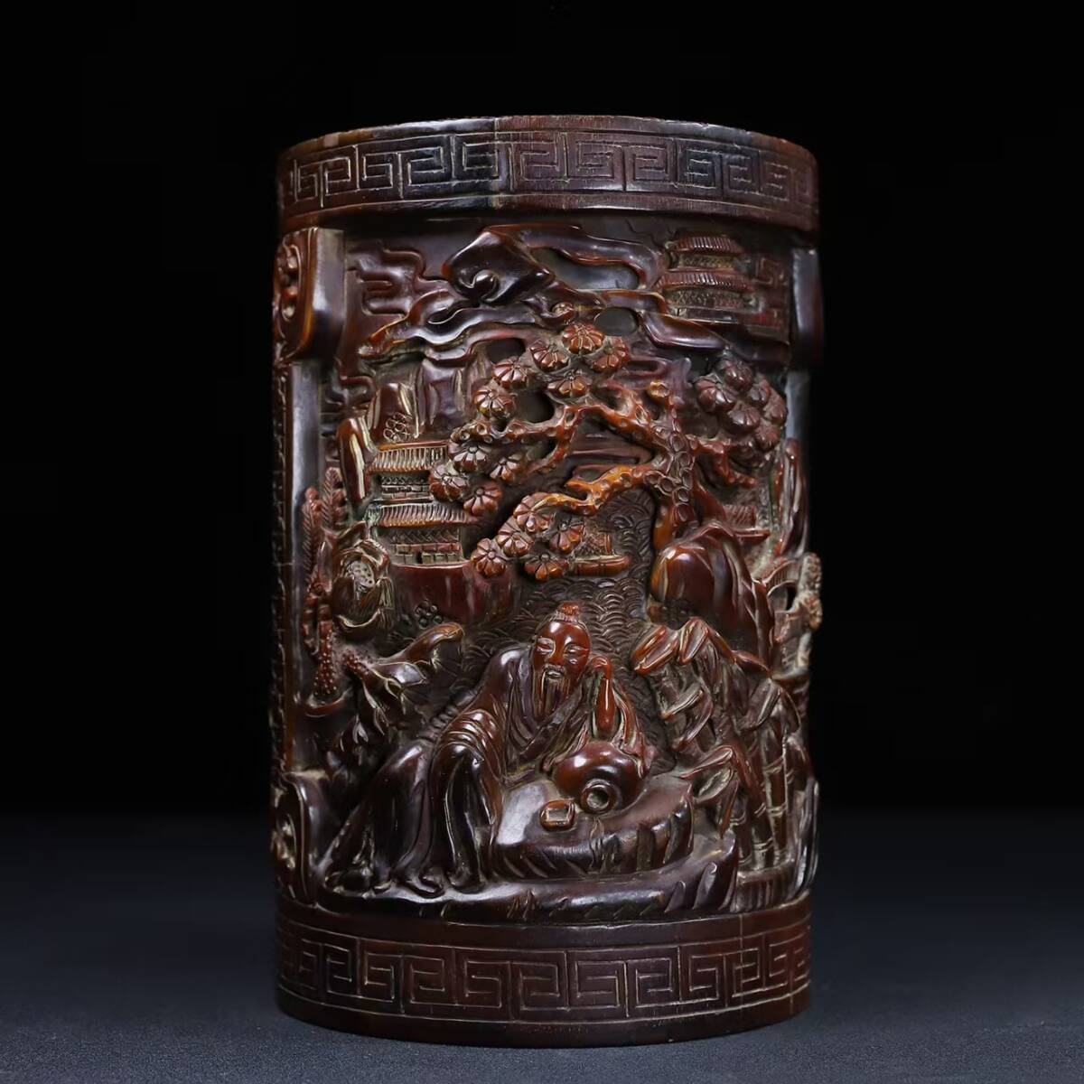 - 旧蔵 牛角彫 山水人物 筆筒 古擺件 古置物 中国古玩 骨董品 時代物 稀少唐物