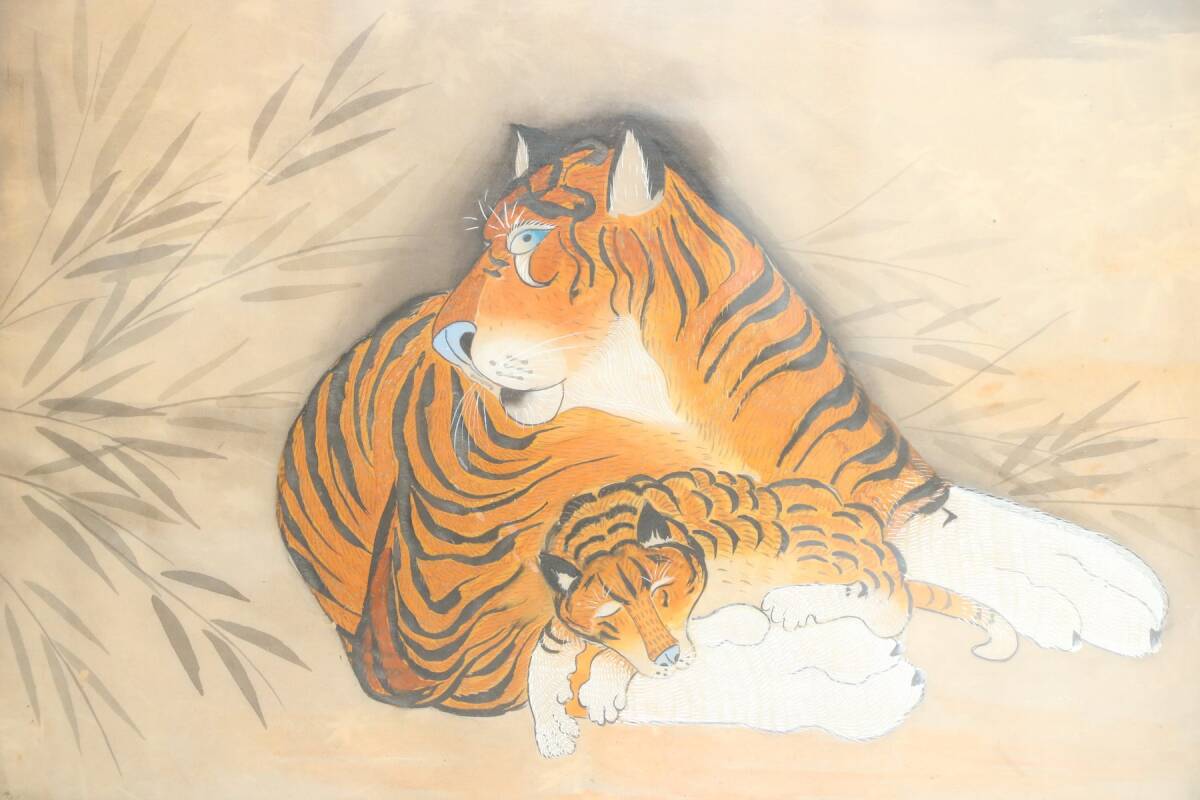 - 作者不明 親子虎図 猫虎 絹本 額装 肉筆 無銘 朝鮮 中国 李朝 清朝 高麗 清明代 絵画 美術品 日本画 額