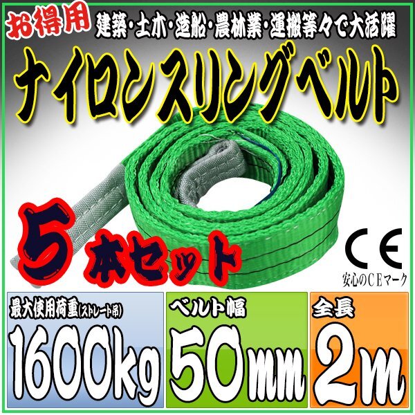 > スリングベルト 5本セット 2m 幅50mm 使用荷重1600kg 1.6t 吊りベルト ベルトスリング [ナイロンスリング 吊上げ ロープ 牽引 運搬]