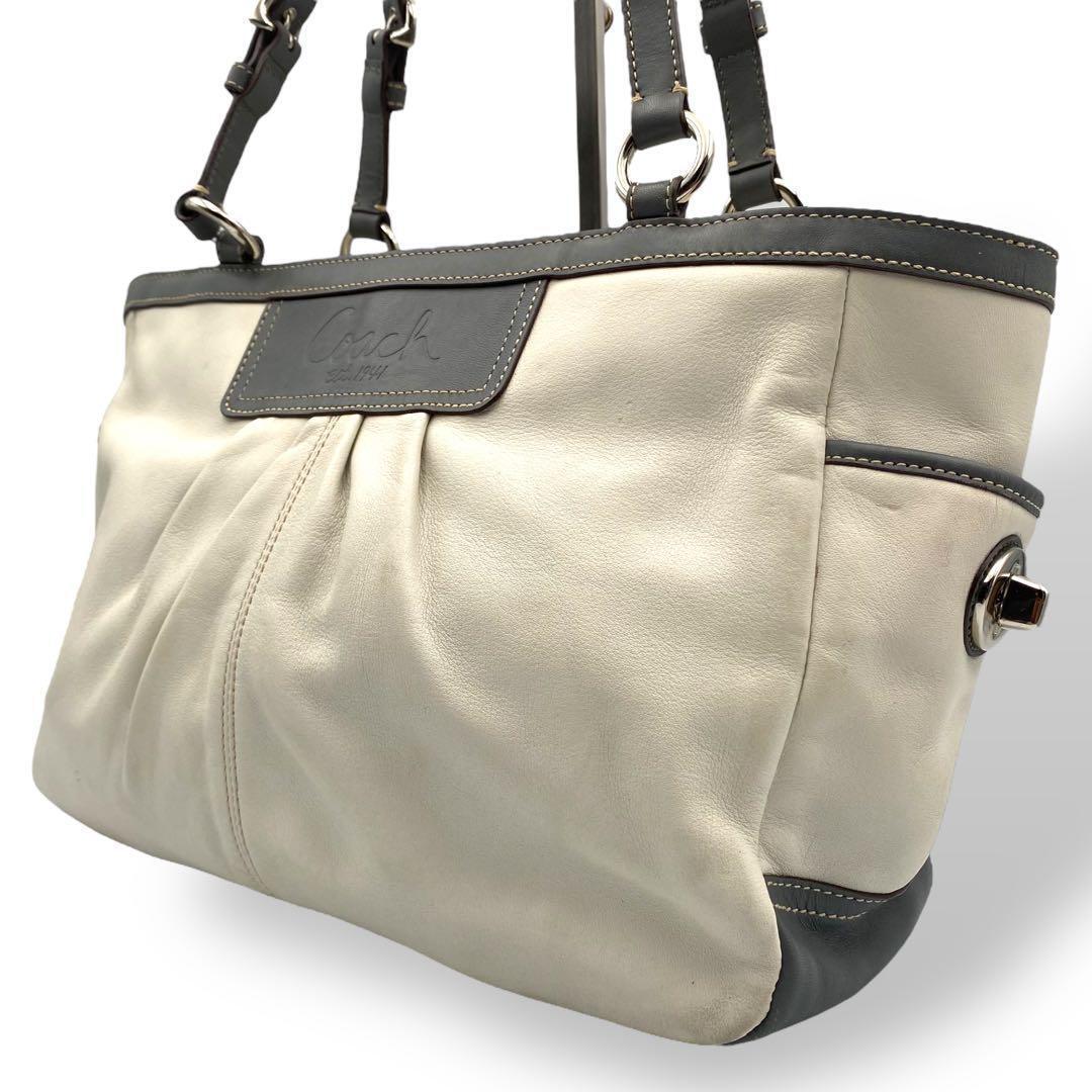 > 美品 COACH コーチ トートバッグ ターンロック オールレザー 灰色 紫 白