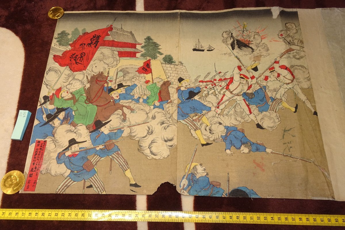 > rarebookkyoto 日清戦争錦絵・浮世絵木版画・作者不詳・仁川戦争特圖・ニ枚セット・尾関岩吉・明治・李朝 1894年 京都古物