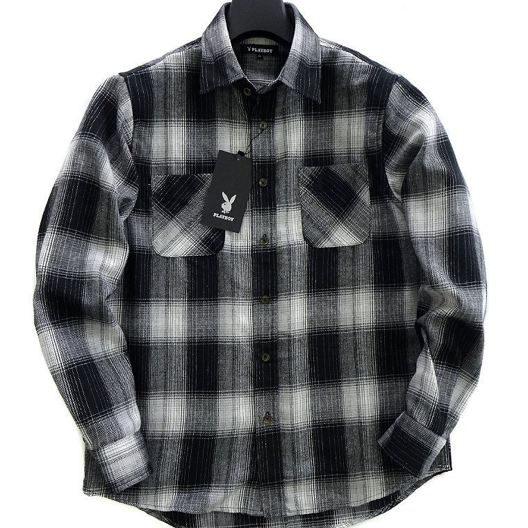 - 新品 プレイボーイ 秋冬 オンブレー チェック ビエラ シャツ L 黒【43024_99_L】 PLAYBOY メンズ 長袖 起毛 フランネル ネルシャツ