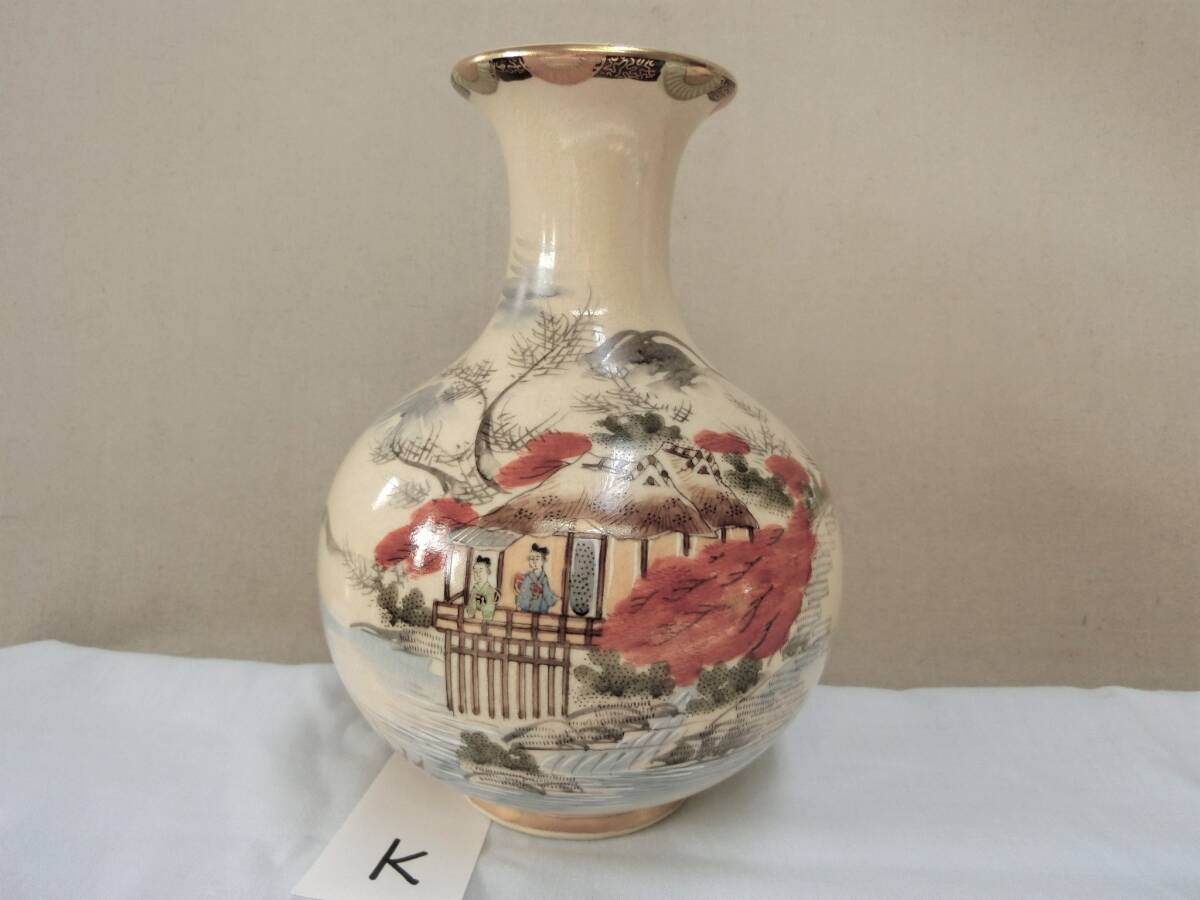 - 海外輸出品!【薩摩焼花瓶 花器 山水家魚文 全面に色絵キレイ 在銘・K・】◆希少品! コレクション 鑑賞陶磁器 美術品