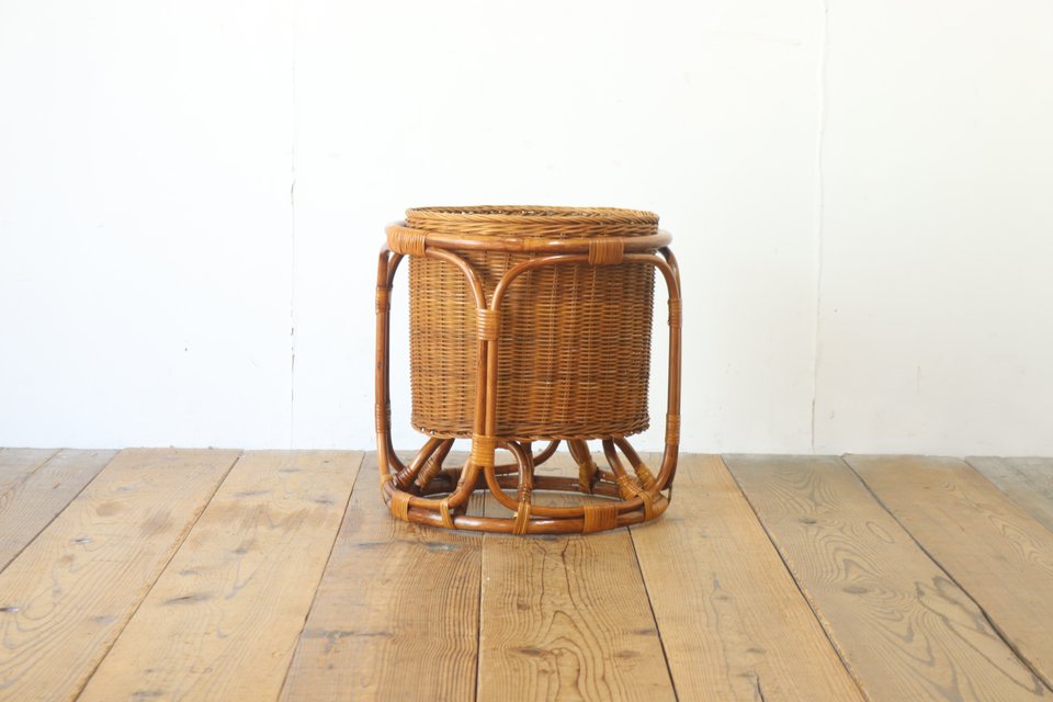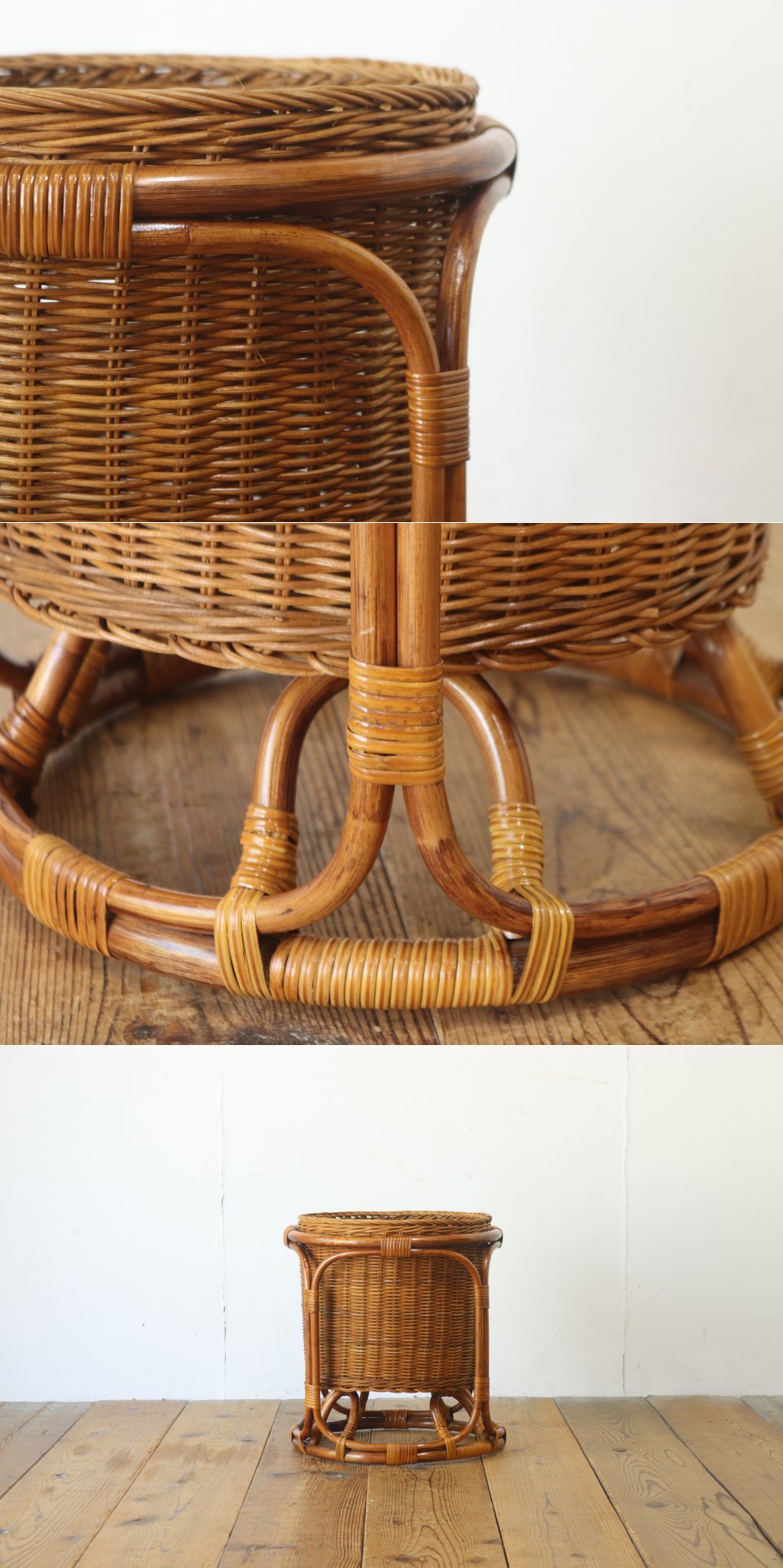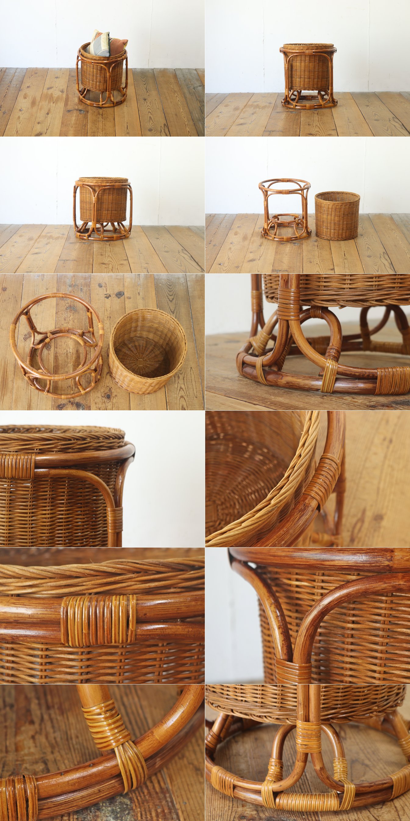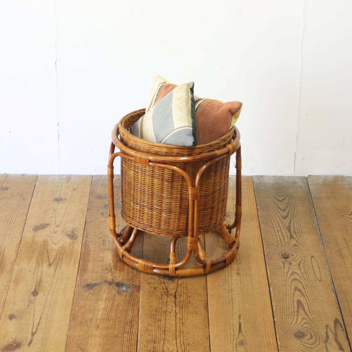 - ラタン ランドリー バスケット 脱衣かご 籠 ラック 籐家具 収納 フレーム付き 円形 ヴィンテージ/レトロ北欧アンティーク英国/PHT26162