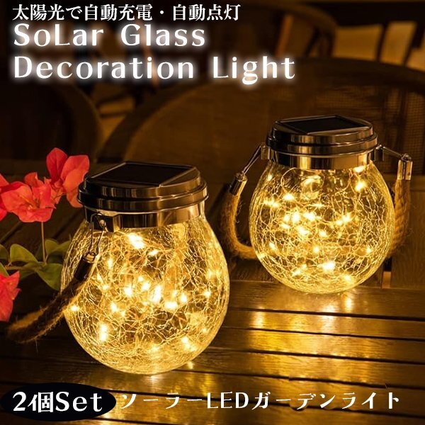 > ソーラーガラス デコレーションライト 2個set ガーデンライト LEDライト ガラス 太陽光 充電 発電 屋外 室内 防水 電球色 おしゃれ 庭防犯