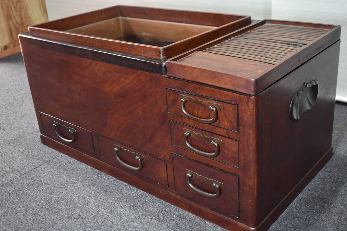 > ■逸品 美しい杢目 欅泡杢 無垢材 黒柿縁 5杯抽斗 大振り 時代 江戸前長火鉢 W907 x D473 x H428/茶道具/囲炉裏/関東火鉢/漆』■