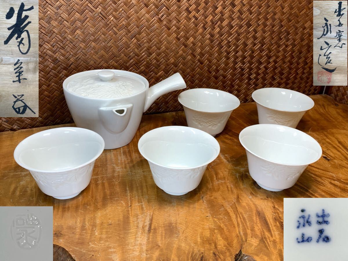 - 煎茶道具 出石窯 永澤永山 作 白磁 菊彫紋 番茶器 共箱 在銘 急須 湯呑 煎茶器 茶道具 茶器 懐石道具 華道具 和美術 和骨董 茶碗 古玩 酒器