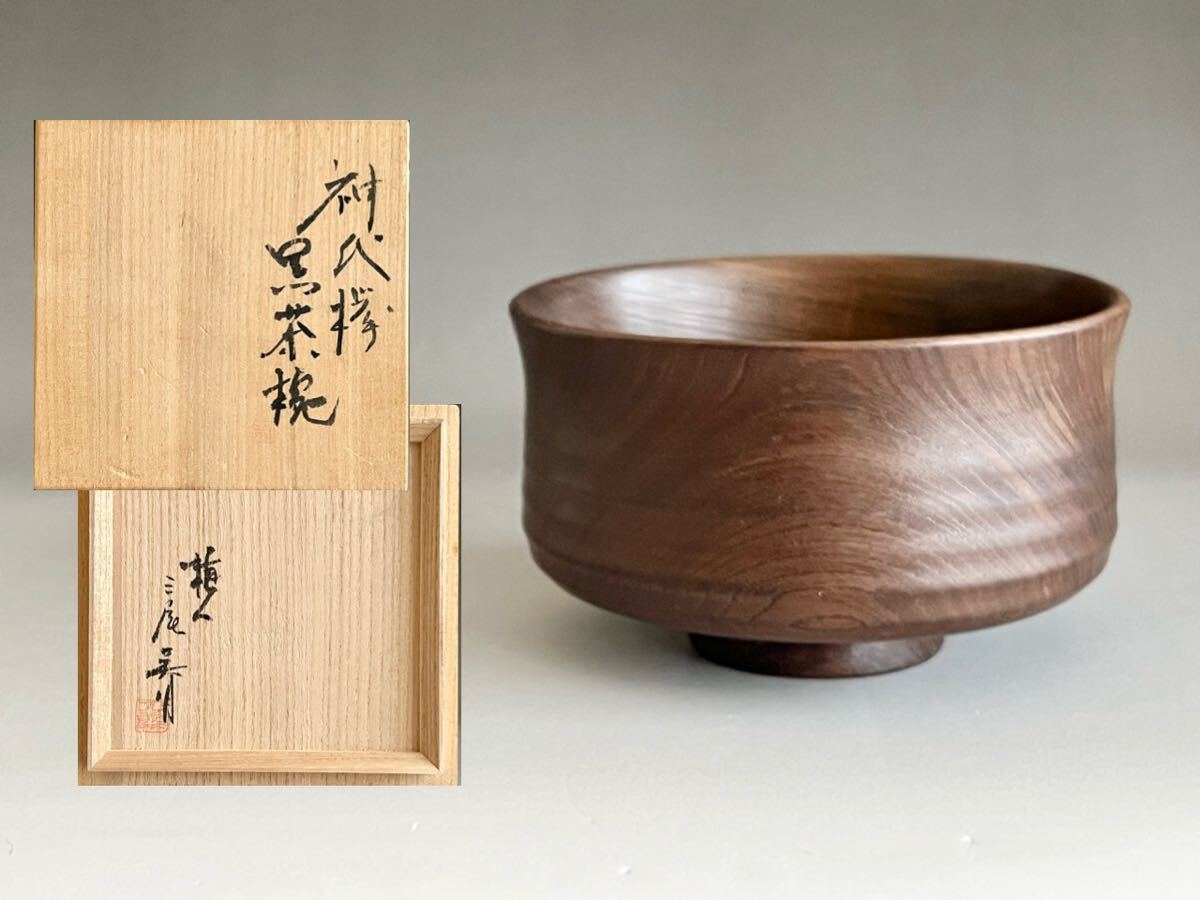 - ● 三尾英明 神氏欅 黒茶碗 茶道具 木彫