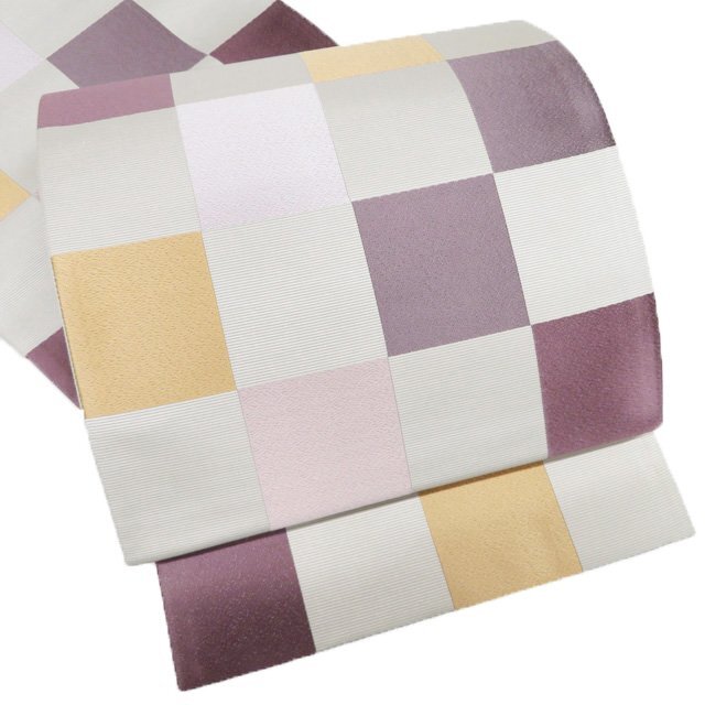 - 袋帯 中古 リサイクル 正絹 カジュアル 仕立て上がり 全通 市松模様 絹鼠色 マルチカラー 多色 きもの北條 A1283-12