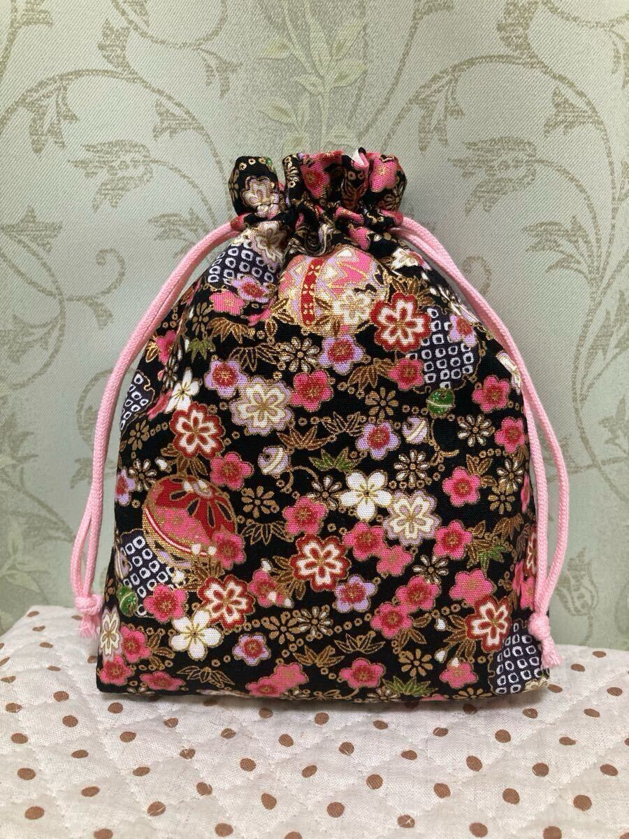 - 巾着袋 巾着 和柄 手毬 花 ハンドメイド マチあり 金彩加工