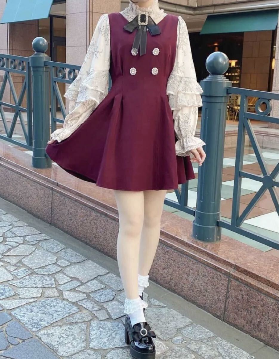 - 美品ROJITA 配色レーシースタンドカラーワンピース (ボルドー)