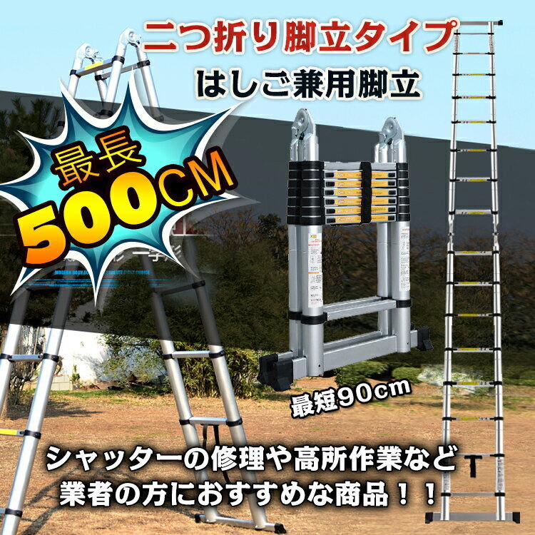- 送料無料 はしご 5m 伸縮 梯子 アルミ製 伸縮はしご ハシゴ 二つ折り 脚立 スーパーラダー スライド式 ロック 作業 洗車 足場 掃除 zk110