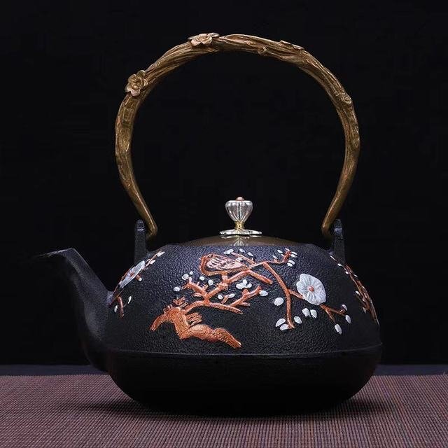 - 鉄瓶 鋳鉄 急須 古風鉄瓶 鉄分補給 提梁壺 茶壺 水壷 煮茶壷 鉄びん 茶道具 おしゃれ 梅 鵲