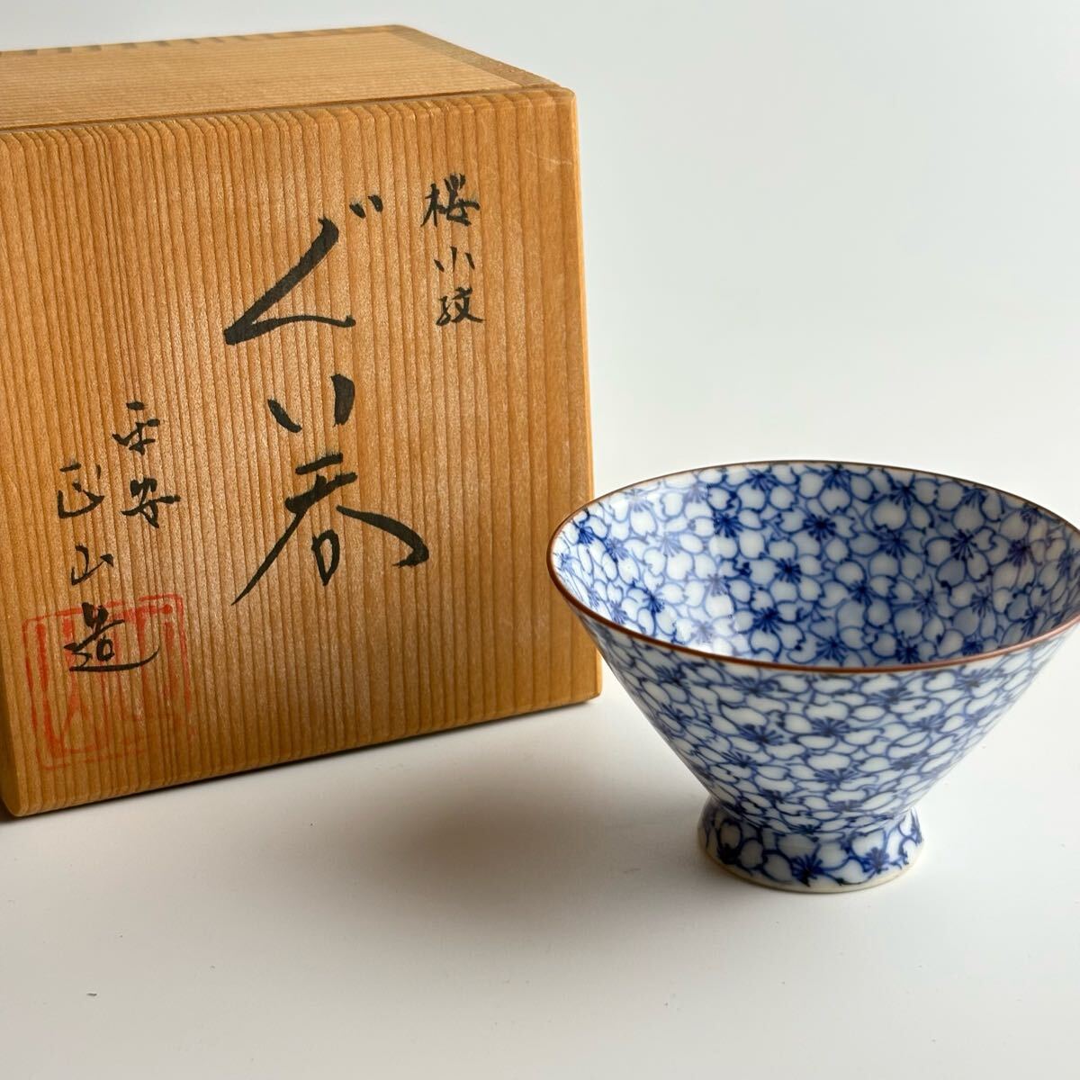 - 京焼・清水焼 平安 助田正山 桜小紋 ぐい呑 共箱 酒杯 お猪口 盃 酒器 桜詰 助田穂山の三男TE-5