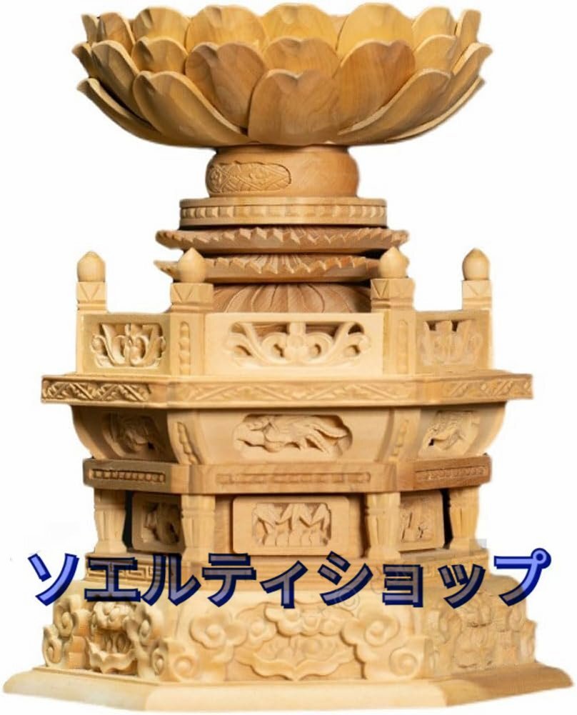 - 木彫り【六角仏像台】天然ツゲ材使用 仏壇用の仏具・仏像をのせる台・仏像置台・仏台 (高さ15cm×巾8.5cm)