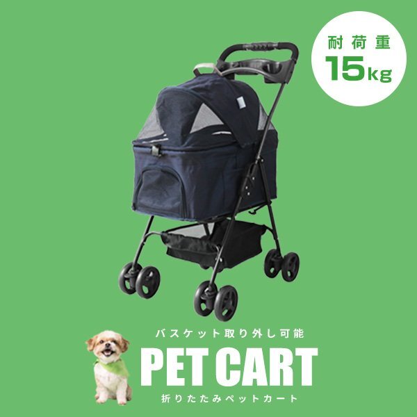 - 【ネイビー】新品 ペットカート 分離式 バスケット取り外し可能 4輪 耐荷重15kg 折りたたみ ペットバギー 小型犬 中型 軽量 おしゃれ