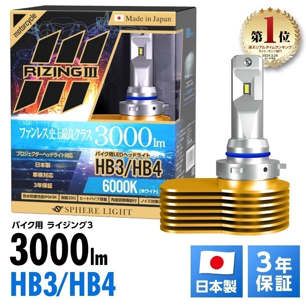 > 3年保証 スフィアライト バイク用 RIZING3 HB3/HB4 6000K 3000lm DC12V 耐震 防水防塵 日本製 LED ヘッドライト ライジング3 SLRZBHB060