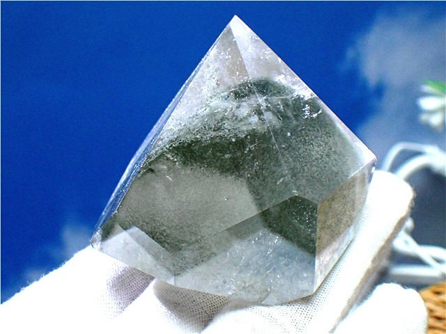 「庭園水晶」別名「幽霊水晶」と呼ばれる。この水晶は、「金運を引き寄せる」事ができることから、ビジネスに携わる人々のお守りとして古来より珍重されている。この水晶は、「向上心の発揚」「開放感の高揚」「財を集める能力の向上」などの効力があると信じられてきた金運向上;硬度:7