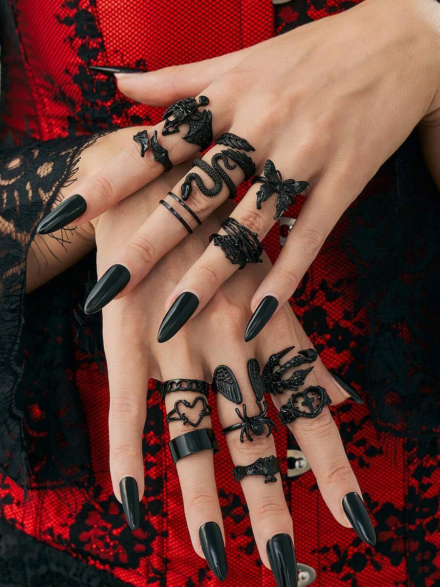 - リング レディース セット 16個セット パンク ゴシック スタイル リングセット、マルチエレメント スカル、クモ、コウモリ、十字