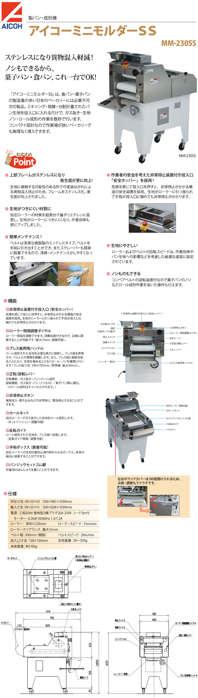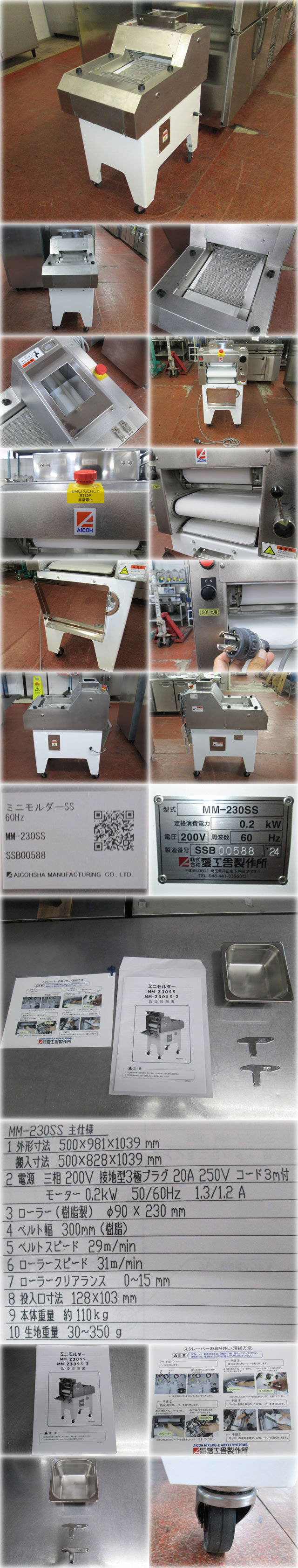 > 【未使用品 2024年製】愛工舎製作所 製パン用成型機 アイコーミニモルダーSS MM-230SS 三相200V 60Hz用 投入口寸法128x103mm ベルト幅300mm