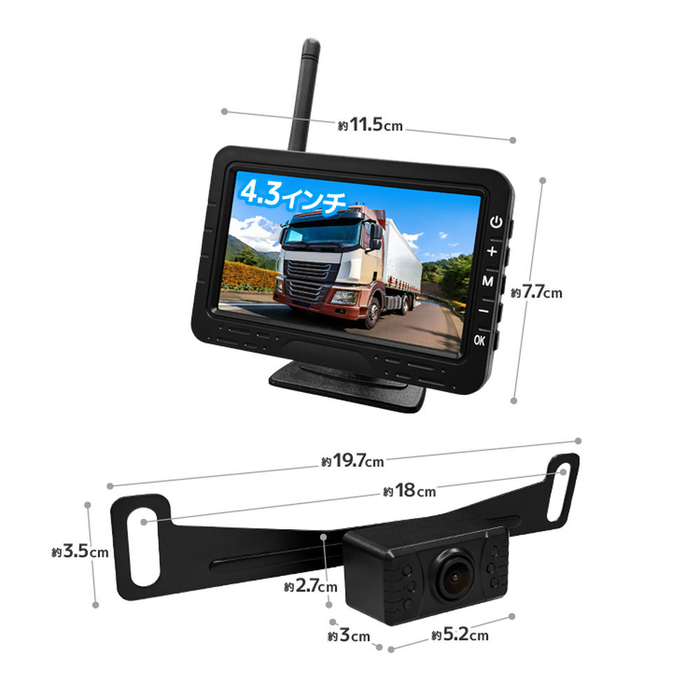 - ワイヤレスバックカメラ デジタル信号 4.3インチモニター 12V/24V対応 正像 鏡像 ガイドライン 暗視対応 リア/フロント両用 GW-A4103S