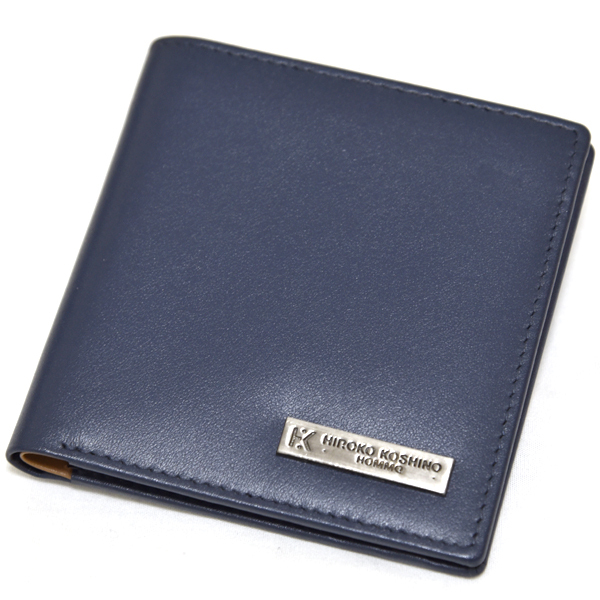 > 新品 本革 コンパクトウォレット HIROKO KOSHINO HOMME メンズ 二つ折り財布 小銭入れあり レザー ネイビー 紺 未使用 薄い コシノヒロコ