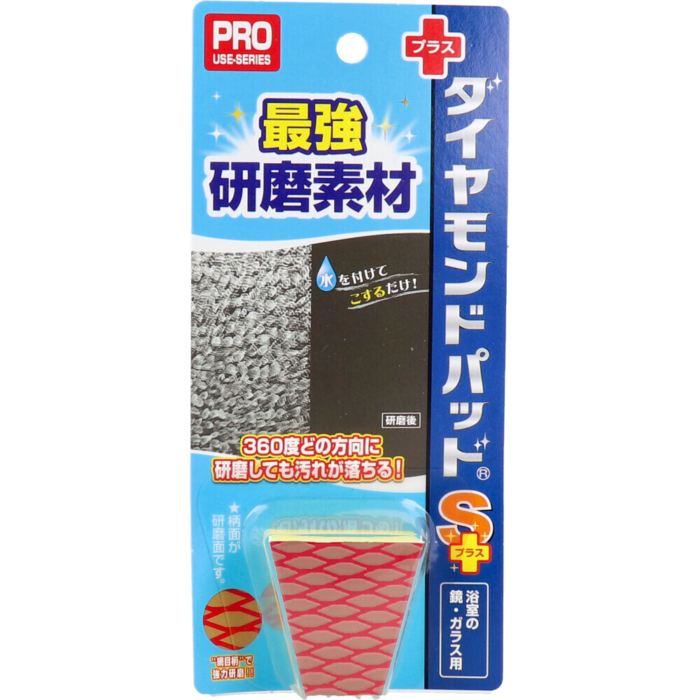 ▼▼▼▼▼▼注意事項▼▼▼▼▼▼・送料込み(送料650円が商品価格に含まれています) 一部地域では追加送料あり。・お取り寄せ商品です。弊社にて手配後、メーカー・卸業者からの直送になります。・まれにメーカー欠品、出荷遅延等が発生致します。問題発生時は別途メールにてご連絡致します。・配送方法の指定、日時指定、置き配、ギフト対応、他商品との同梱配送などは対応できません。・まとめ買いや複数購入の場合は通常より発送に時間が掛かる場合がございます・複数個口の場合、2階以上への搬入ができない場合があります。(その場合は1階での受け渡しとなります)・大型連休、お盆、年末年始などは発送をお休みさせていただく場合がございます・メーカー都合により、パッケージは予告なく変更される場合がございます・梱包用のダンボールはリサイクル品を使用させていただきます。・注文に関するご連絡(注文確定通知・発送通知など)はメールでご案内させていただきます※商品ページの内容について、少しでもご不明な点などがございましたら購入前に一度ご連絡ください▲▲▲▲▲▲注意事項▲▲▲▲▲▲〇商品説明水を付けてこするだけ!高級な業務用を家庭用にコンパクトサイズにしました。●最硬質な研磨素材「人工ダイヤモンド」を使用した、ガンコで固着したような汚れを落す、プロ仕様の高級研磨ツールです。●研磨材入りのクリーナーや溶剤などで落しきれなかった汚れを、水を付けて擦るだけで落とせます。●研磨面がすり減るまで繰り返し使えます。●360度どの方向に研磨しても汚れが落ちる!●S+(プラス):キズが付きづらい。人工ダイヤモンドを独自の技術で特殊加工し、キズが付きづらく、汚れだけを擦り取れる、最強のタイプです。【品名】ダイヤモンド研磨剤【用途】鏡・ガラス用頑固汚れ除去・鏡・透明ガラス(陶器・タイル・御影石も可。試しが必要です。)・浴室の鏡のガンコな鱗状痕(うろこ)に最適。【材質】研磨部:人工ダイヤモンド、ポリウレタン、不織布スポンジ部:ポリエチレン【使用方法】※説明書をよく読み、保管しておく。(1)鏡などの汚れの付いた研磨する面の汚れを、よく水洗いする。※ほこりなどがあると、キズの原因になる。(2)鏡などの汚れの付いた研磨する面に水を付けながら、研磨面(赤とベージュの柄面)で平行に均等の力で、同じところを少しずつ擦る。※本製品は上下左右どの方向にもご使用いただけます。(3)最初ザラザラという触感があり、それが無くなってくると汚れが落ちてきており、汚れが落ちきるまで、繰り返します(汚れの度合いによる)。(4)作業後は研磨した面をよく水洗いし、乾いた布で水分を十分に拭きとる。(5)パッドの使用後は、よく水洗いし、水分を拭き取り、乾燥させて保管。【使えないもの】※特殊な素材はメーカーに相談する。すりガラス・エッチングガラス等の特殊加工ガラス、曇り止め加工・撥水加工・フィルム加工・コーティング加工したガラス・鏡、樹脂ガラス、車のガラス・バックミラー、眼鏡レンズ、樹脂製品、金属、塗装面、軟質な石材※高性能な研磨材として、陶器・石材・金属など多用途にも使えるが、素材によりキズが付く場合があるので、十分に注意して使用する。【注意事項】・鏡・透明ガラス用です。・用途以外に使用しない。・高温・火気の近くに置かない。・研磨する時に、鏡やガラスを強く押えると破損の恐れがあるので注意。・間違って使用しないように保管。幼児等の手の届かないところに保管。・ダイヤモンドが硬質のため、ガラスの材質や表面の加工等の条件により、キズが付く場合もあるので、必ず使用前に支障のない部分で、試してから使用する。・長期間放置し経年変化した汚れや、水質などの諸条件により、全ての汚れが落せるものではありません。〇商品仕様個装サイズ:85X185X28mm個装重量:約13g内容量:1個入ケースサイズ:27X9.5X19.5cmケース重量:約0.408kg製造国:日本【発売元:株式会社ヒューマンシステム】(出典:ヒューマンシステム)