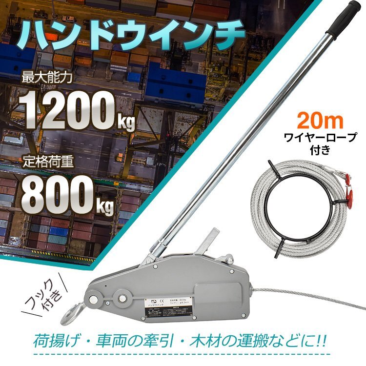 - ハンドウインチ 手動式 800kg チルホール フック付き 20m ワイヤーロープ レバーホイスト 荷締機 土木 林業 伐採 牽引 重量物 工具 ny614