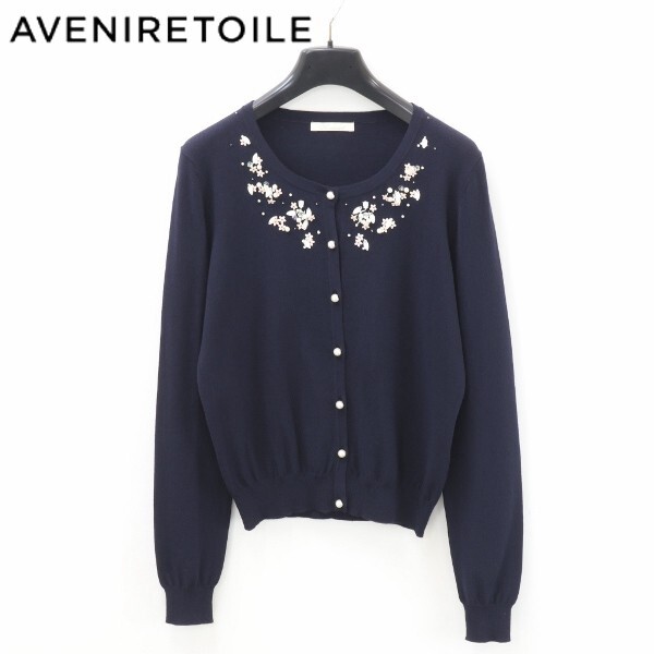 > 【KA258】美品◆AVENIRETOILE アベニールエトワール フラワースパンコール パール釦 ニット カーディガン トップス 紺 ネイビー 38
