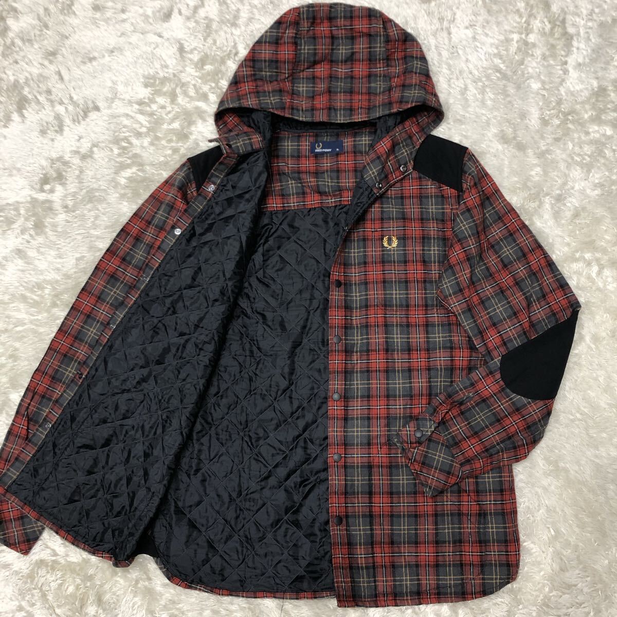 - 超希少XL!フレッドペリー【お洒落の極み】FRED PERRY キルティングジャケット パーカー フーディ ×灰 ロゴ刺繍 エルボーパッチ 中綿 LL