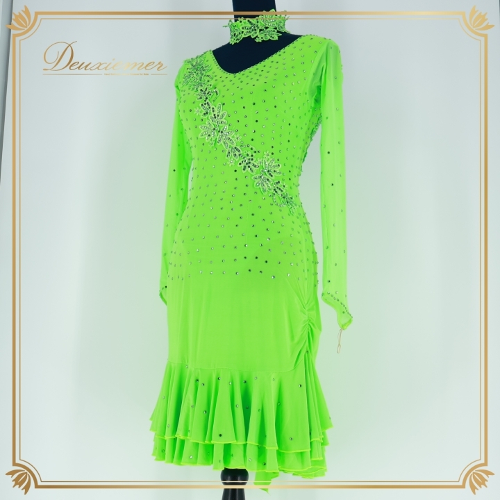 - 社交ダンス 衣装 ラテン ドレス ワンピース 黄緑 蛍光 デモ 競技 ダンス パーティ 発表会 グリーン系 蛍光色 フロア映え 伸縮素材