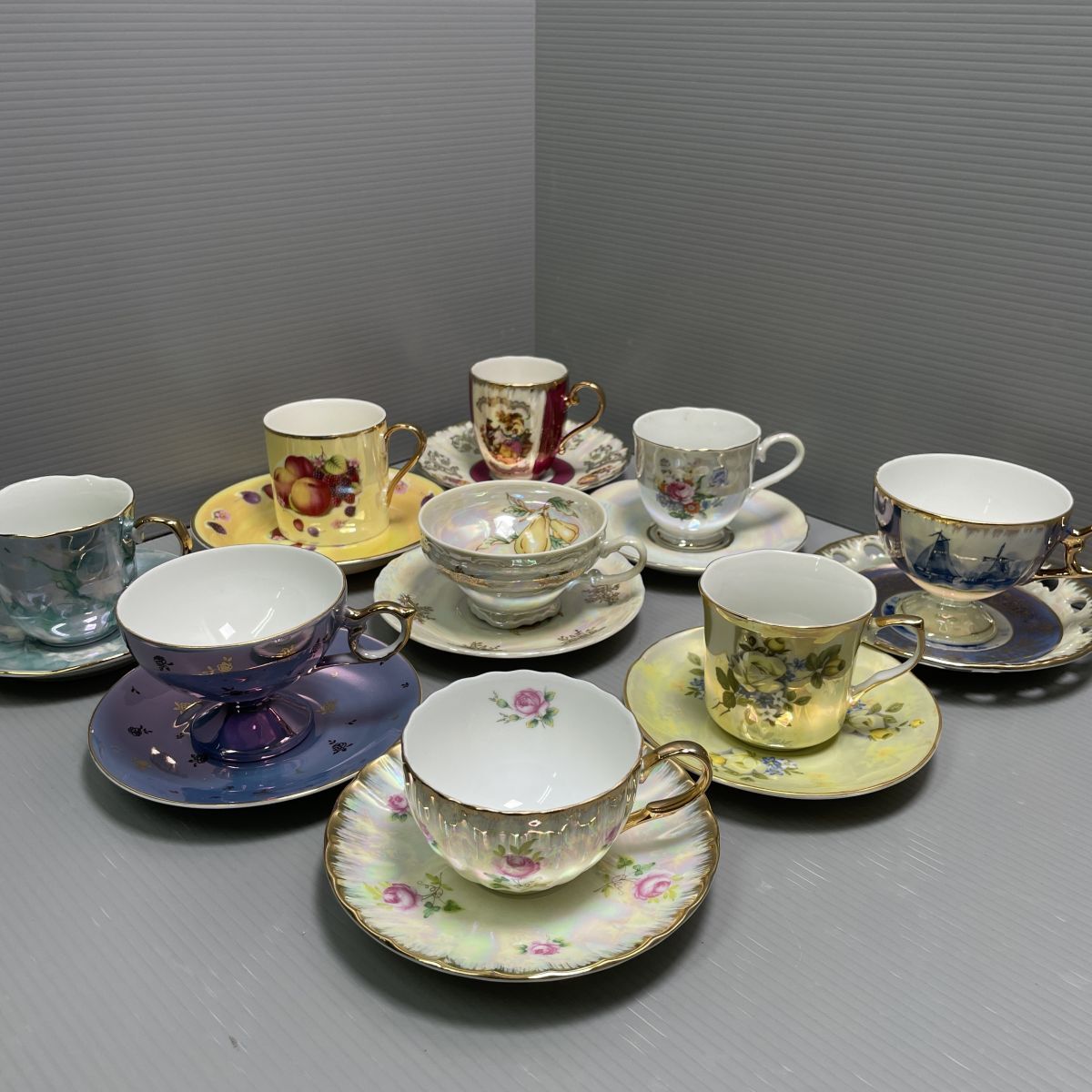 - 12r196 カップ&ソーサー 9客セット ラスター加工 ロココ調 金彩 花柄 C&S おしゃれカフェ可愛い 純喫茶 オーロラ 洋食器 1000-スタート