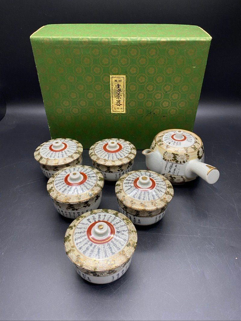- 旧家蔵出し 石川県 伝統工芸 九谷焼 華山 茶器セット 菊 謡曲 高砂 急須 蓋付 湯呑 煎茶 ☆ちょこオク☆80