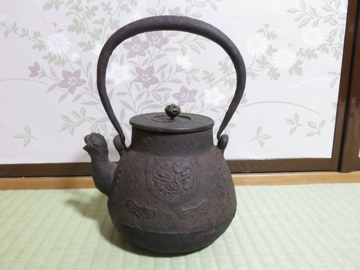 - ●鉄瓶 時代 龍文堂造 名人造 獣口 古代鬼面 煎茶道具 ●