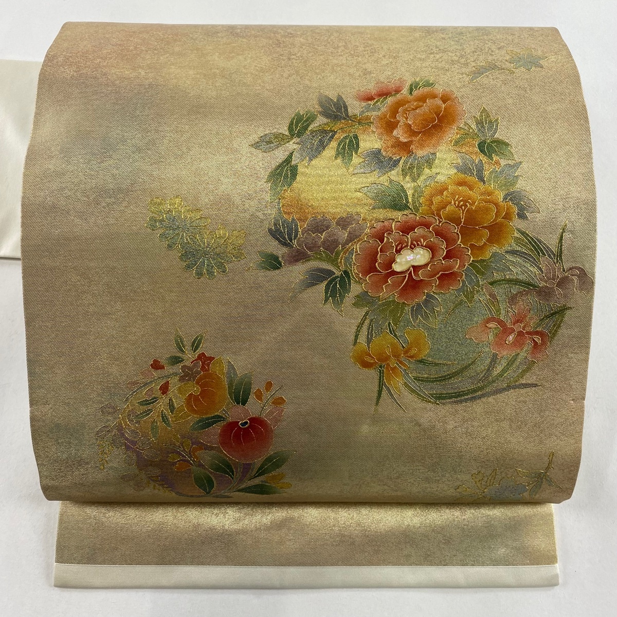 - 名古屋帯 秀品 花丸文 草花 螺鈿 金彩 金色 正絹 【中古】