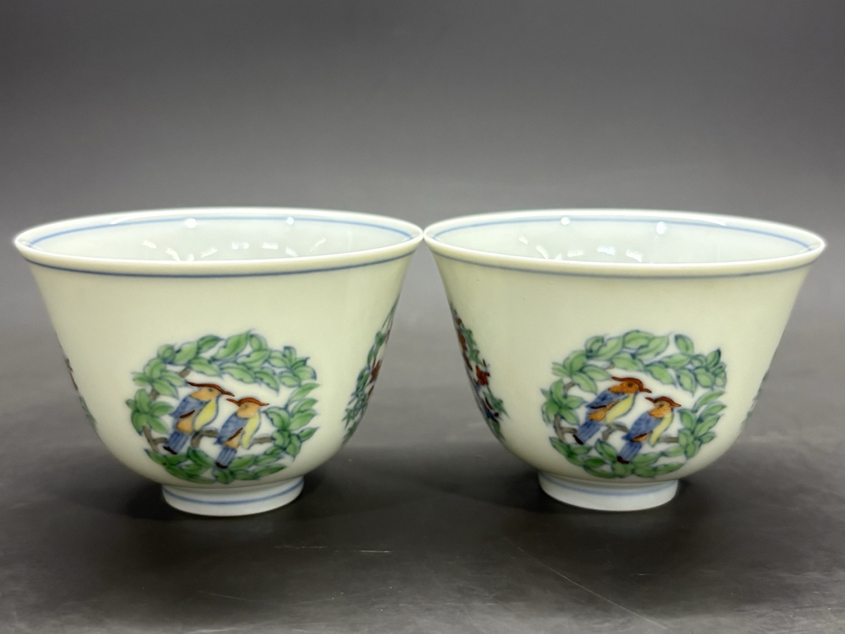 - ▽鴻▽明朝時代 陶磁器 大明成化年製 斗彩花鳥紋杯一対 共箱 時代物 中国古美術 骨董品
