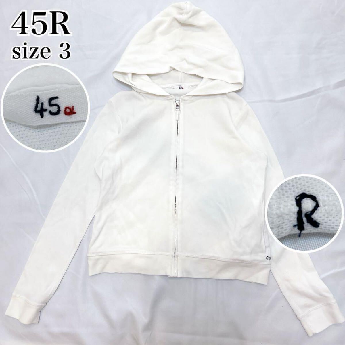 > 45R フード付き ジップアップパーカー R刺繍 ロゴ刺◇サイズ3 ホワイト フルジップ R ロゴ ワンポイント フーディー コットン100 日本製