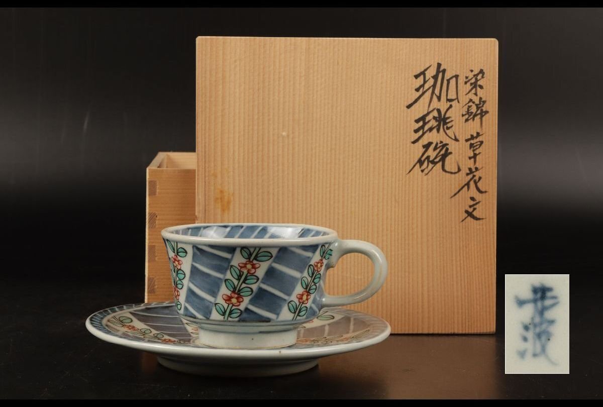 - [URA]佐藤走波/染錦草花紋珈琲碗/共箱/10-10-38 (検索)骨董/珈琲碗/ティーカップ/コーヒーカップ/カップ&ソーサー
