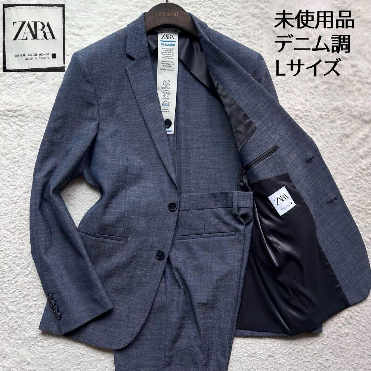> 【紳士の佇まい 未使用品】ZARA スーツ セットアップ ストレッチ easy デニム調 インディゴ 2B ブルー系 青系 Lサイズ 48 タグ付き 希少品