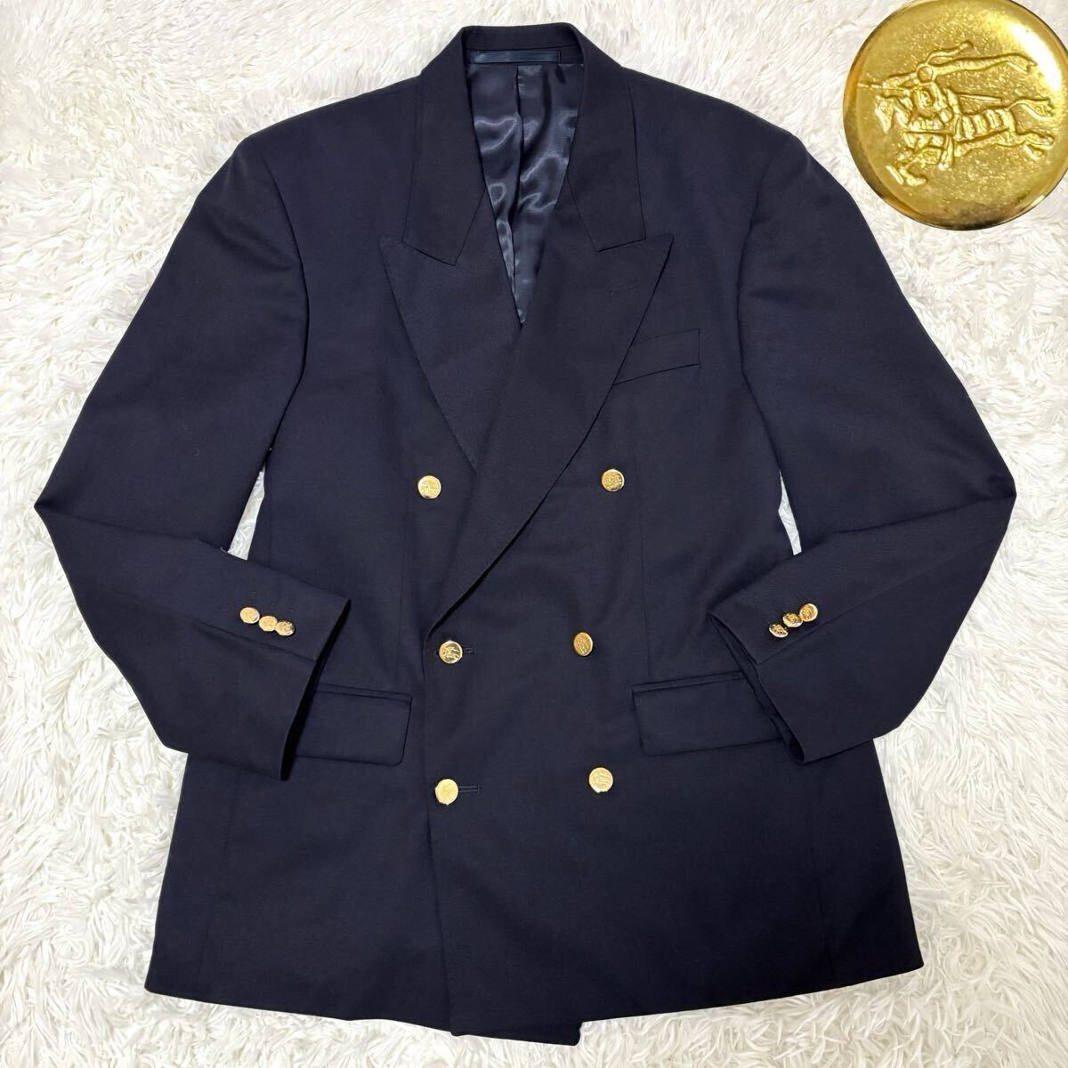 > 【未使用級】XLサイズ バーバリー BURBERRY ホースロゴ刻印金ボタン ダブル 紺ブレ テーラードジャケット 秋冬ブレザー ネイビー LL メンズ