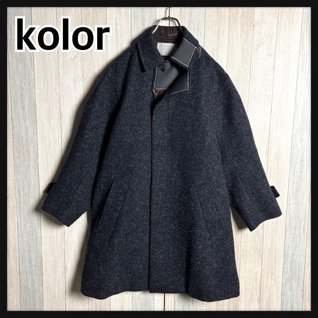 > 【未使用級・極美品】kolor カラー ケンピメルトンウール アシンメトリー 切替 ドッキング ステンカラー ロングコート ブラック・黒 1