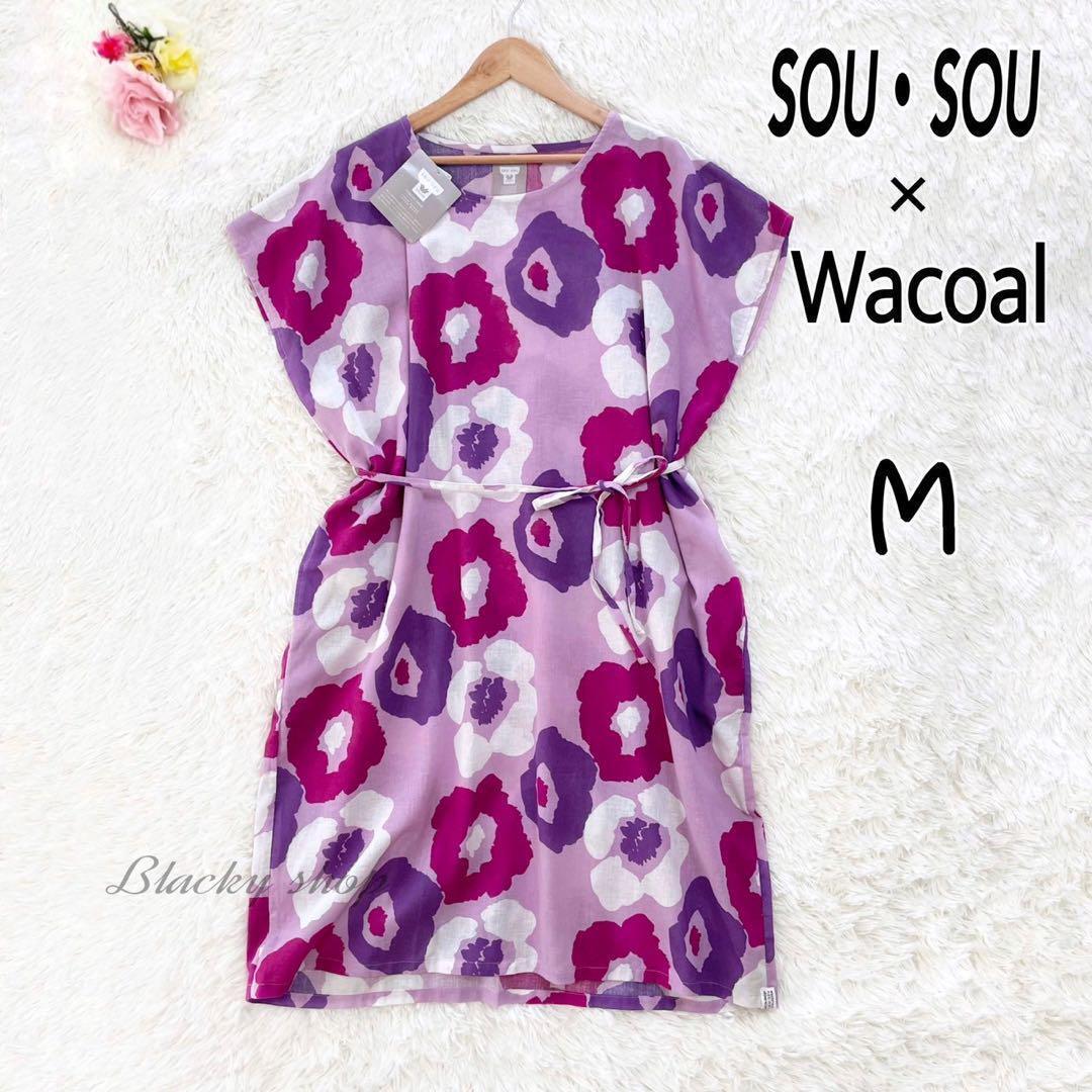 > ソウソウ × ワコール カットソー ワンピース 3分袖 未使用 タグ付き M ラベンダー 花柄 麻 パジャマ ルームウェア Wacoal SOU・SOU
