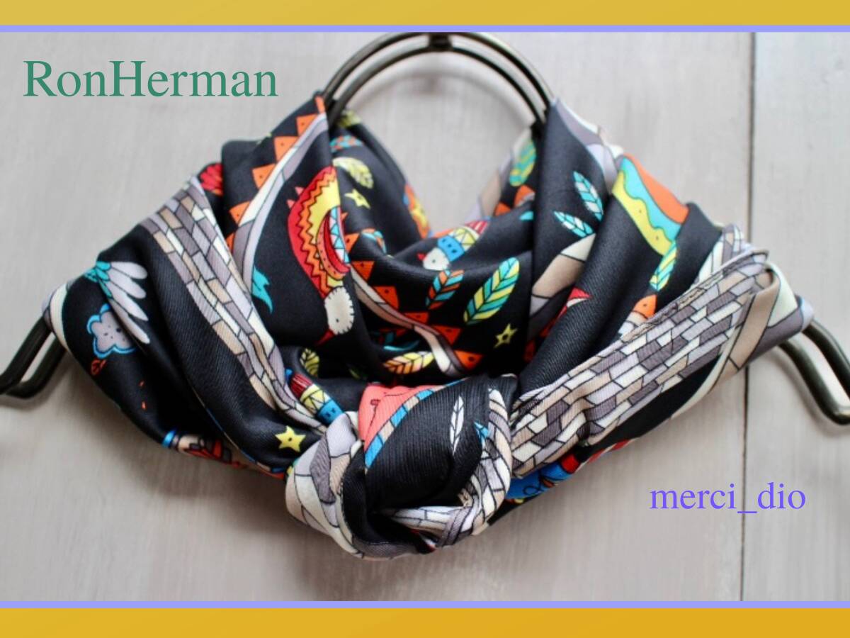 - ロンハーマン RonHerman シルク ポップアート カラフル 大判スカーフ ブラック ストール フラワー ハート 新品 未使用 ドゥーズィエム