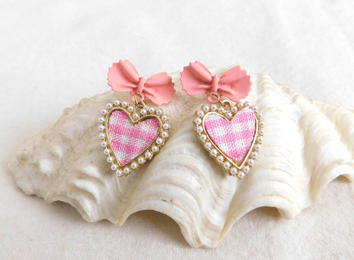 - 【新品】ピンクチェックのハートのピアス ピンクのリボン ハートのピアス